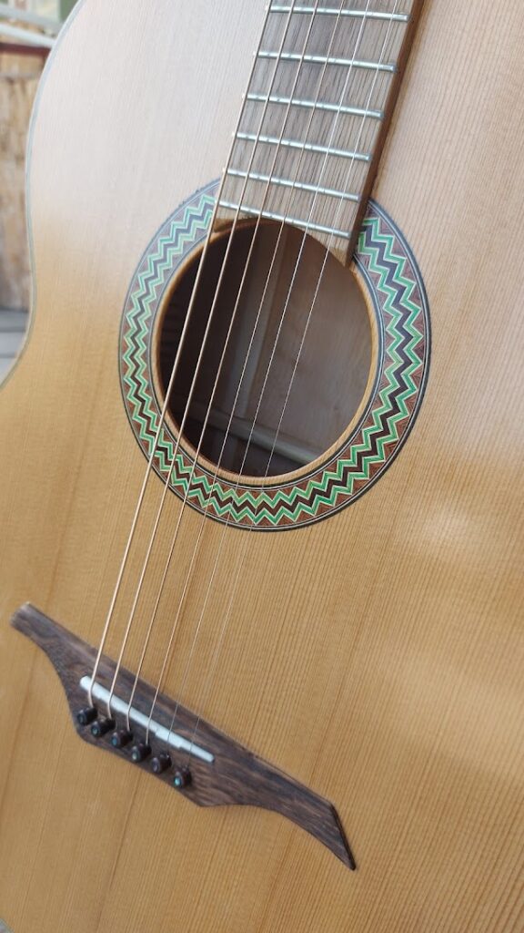Durch den Halsansatz am 12. Bund zeichnet sich diese Gitarre durch eine besonders gute Ansprache aus. Der dünne, handpolierte Schellack unterstützt das Resonanzverhalten der Decke aus Thermofichte, die nicht nur aussieht, wie eine altgediente Fichtendecke. Durch die spezielle Thermobehandlung weist sie auch ähnliche Klangeigenschaften auf.
